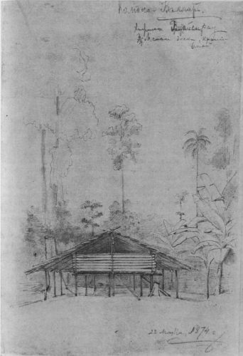 Caption: "Vuousirau hut by Kamaka Vallar Lake. 22 March 1874"