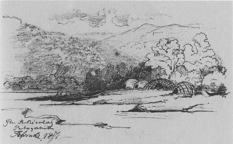 Caption: "Huts in St Nicolas Bay, Patagonia"