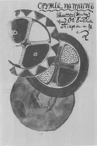 Caption: "Papuan shields of Bili Bili, Tiara (Siara), and Mitebog Islands"