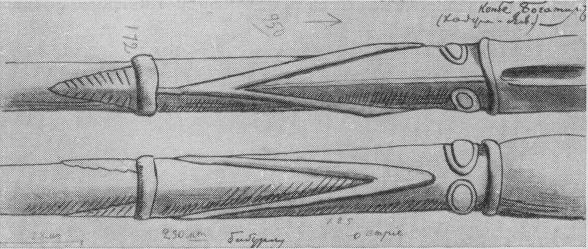 Caption: "Carving on spear. Bogatim (Bogati) village"