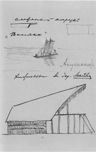 Caption: "Top: sailboat (vanako), Anuapata village; Bottom: Hut in Maiva village"