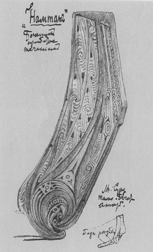 Caption: "Ornamentation on a boat. Brought by the sea to the Maclay Coast, Bogati village, from the south-east coast of New Guinea or nearby islands"