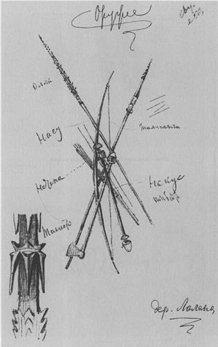 Caption: "Selection of weapons. Bottom left: detail of the barbs of a traditional spear. Village on Lalapa (Lelepe) Island"