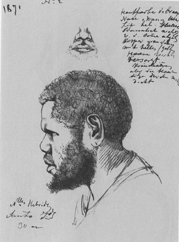 Caption: "Man, 30 years old, from Espiritu-Santo. Drawn on Tahiti in 1871."