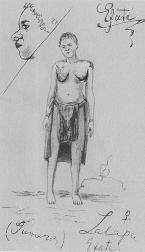 Caption: "Woman with a 'modesty belt' made of tapa. Scarification sketched on her breast. Top left corner: her head in profile with the deformed tip of her nose shown. Lalapa Island"