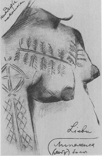 Caption: "Scarification designs (?) on the shoulder and breast of Liebu - a woman from Lalapa Island"
