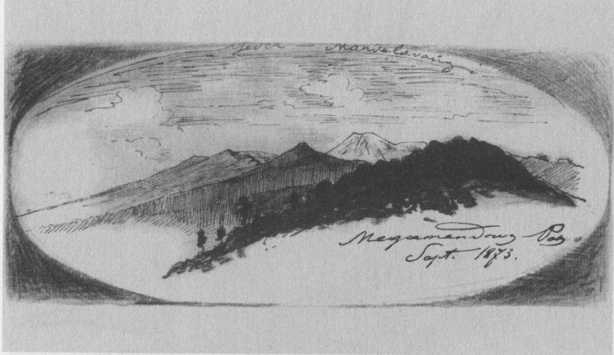 Caption: "Mountains on Java. Mount Gede volcano in the centre"
